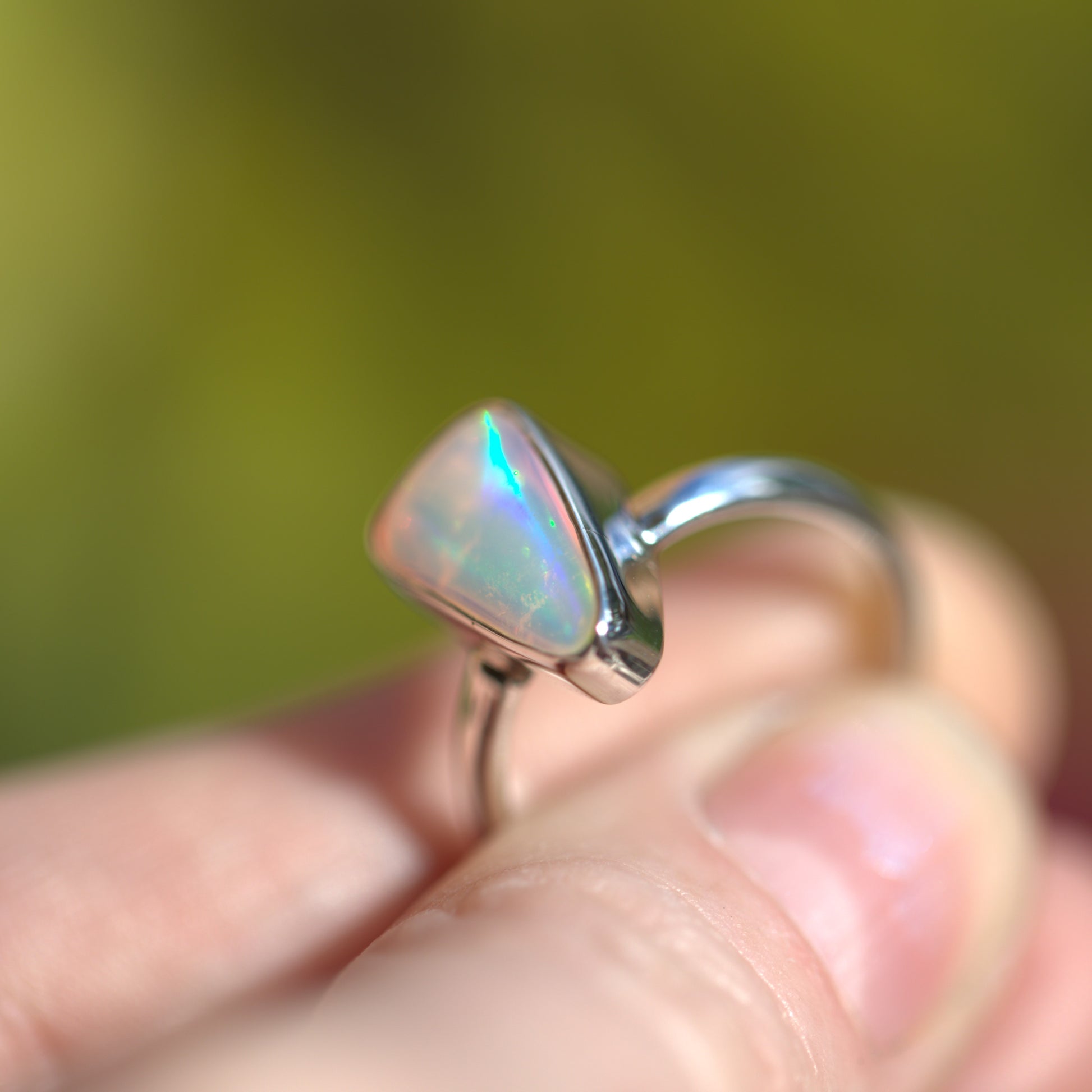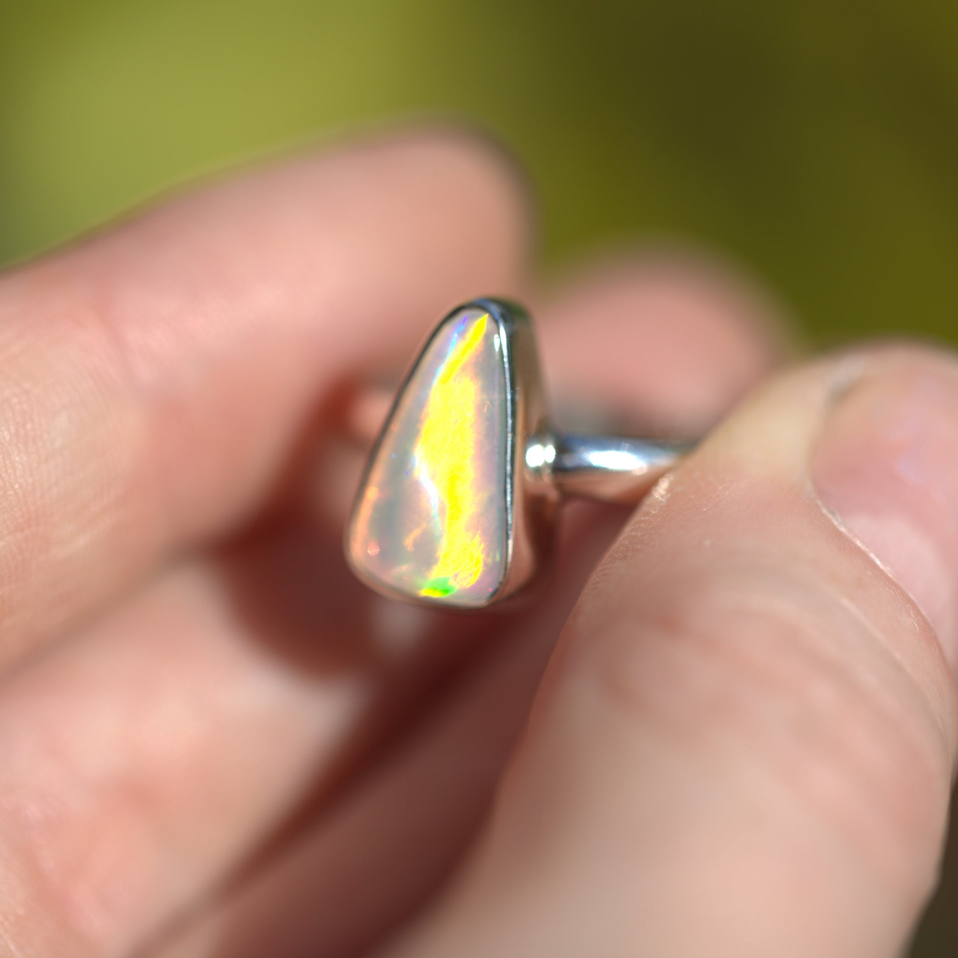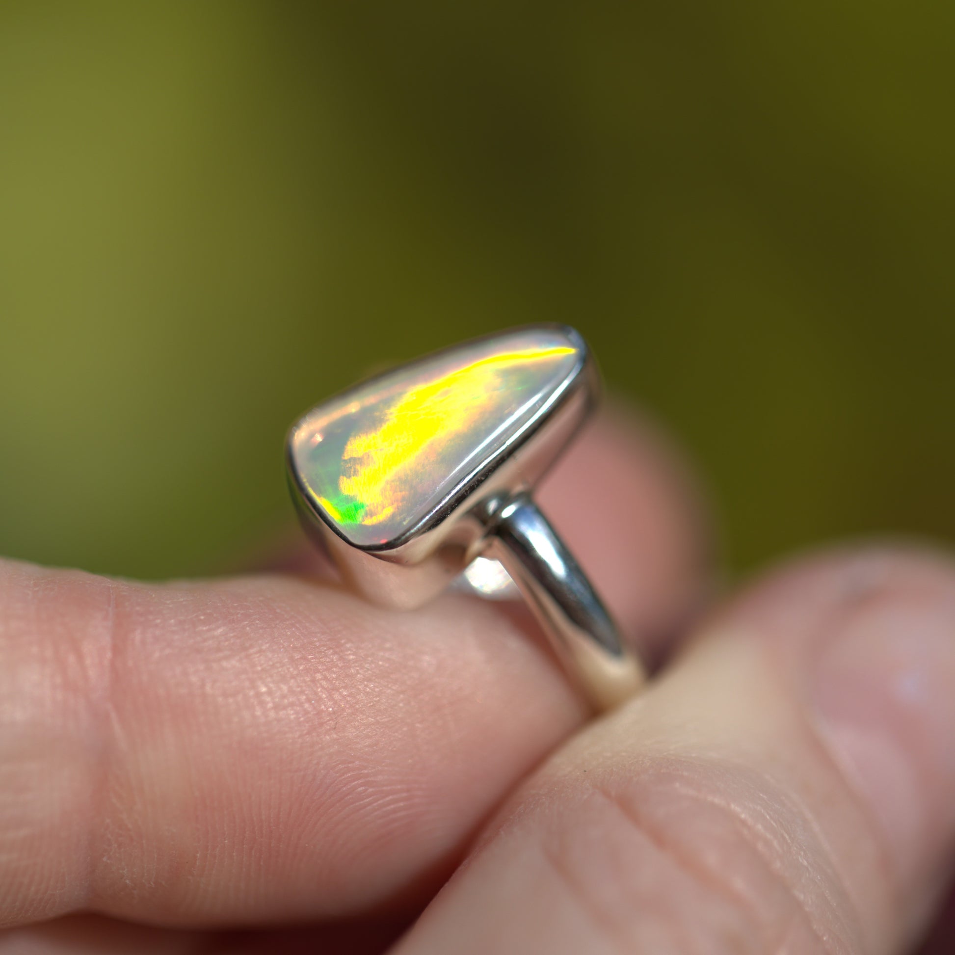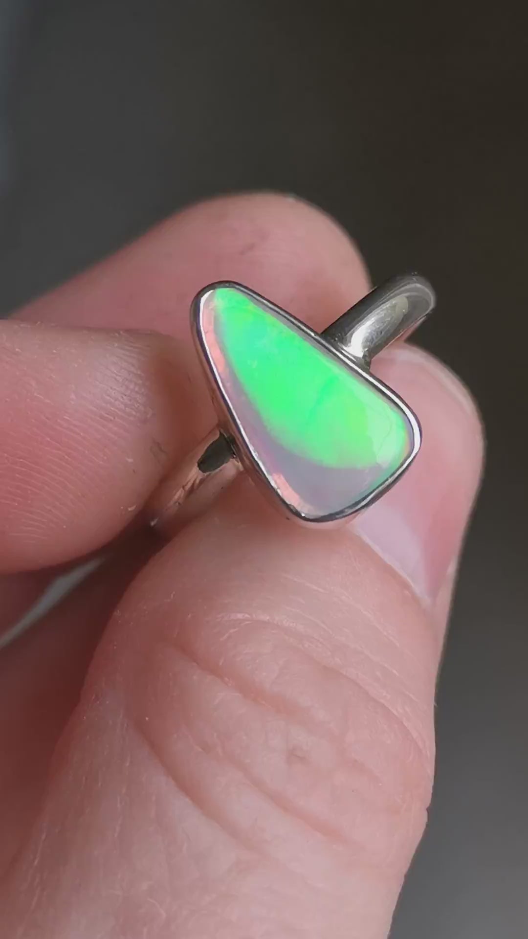 Yet another amazing solid Australian Opal that has to be seen in person to really understand its beauty. The amazing flash in this is like nothing else!! Looking at it straight on, it has NO colour. As soon as you move it though, it's electric. Like the back of a CD. I also have a pair of shoes that match this ring. It's soooo cool!!