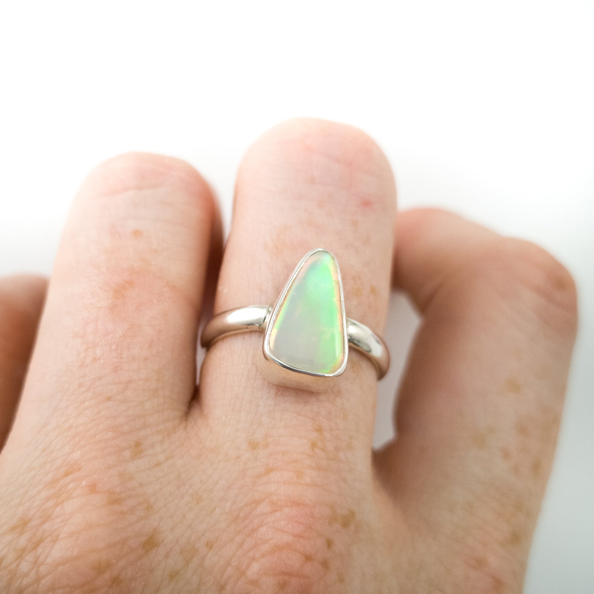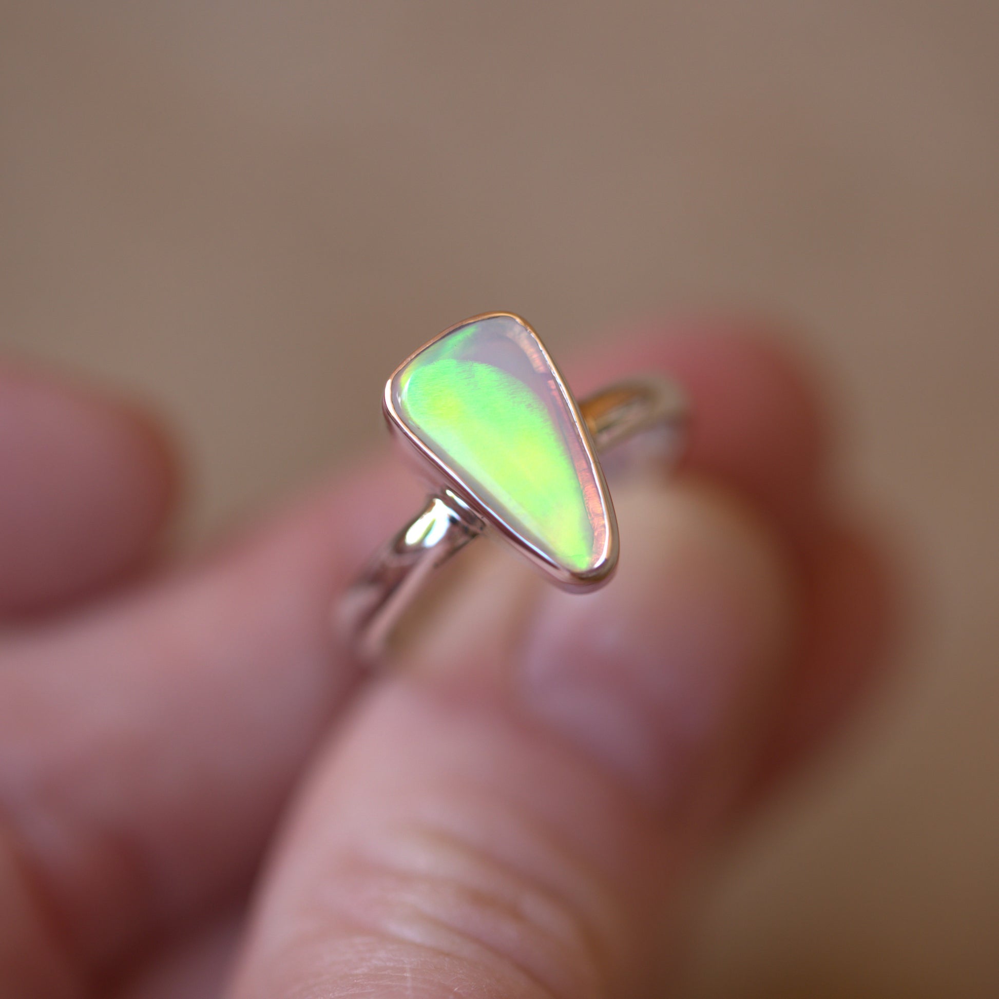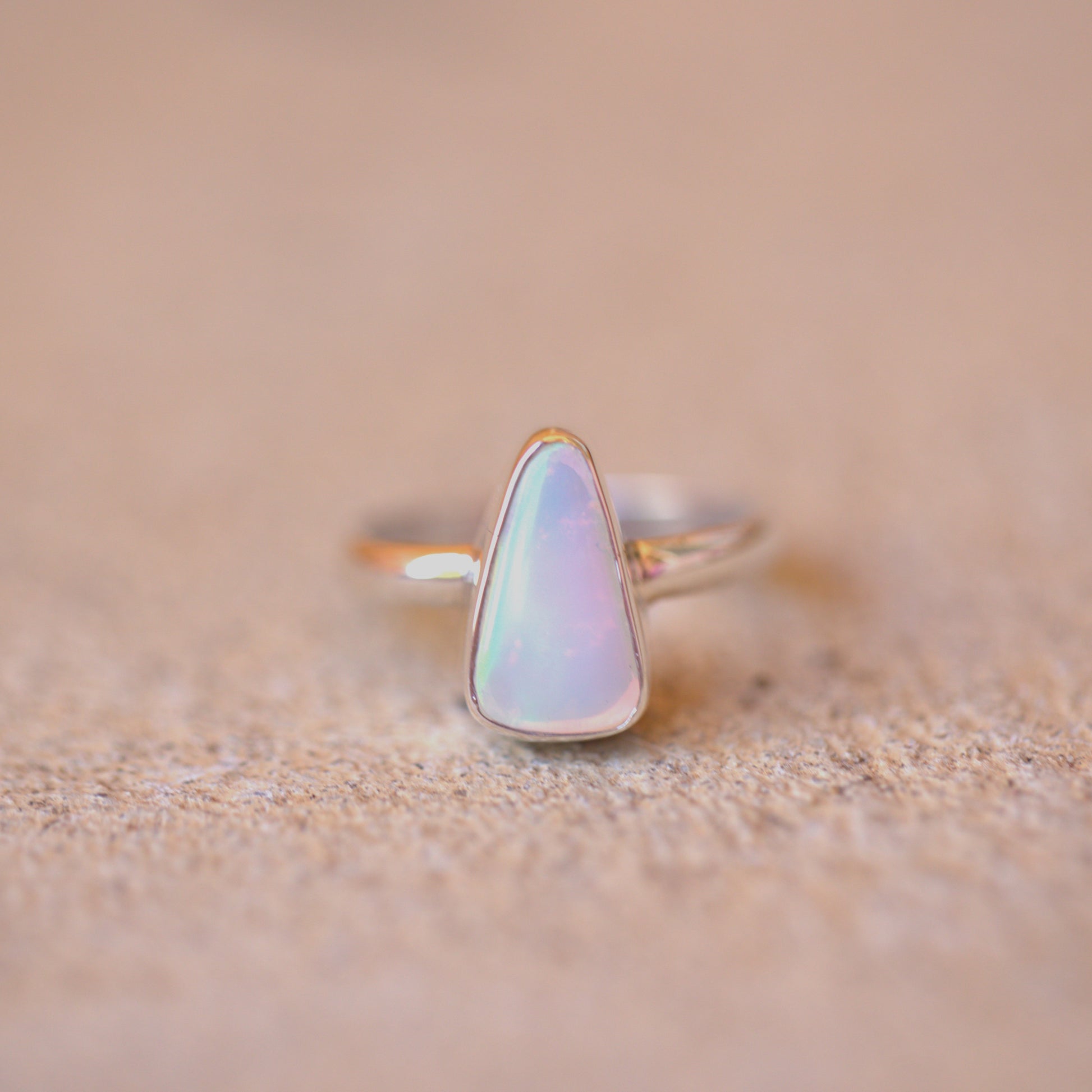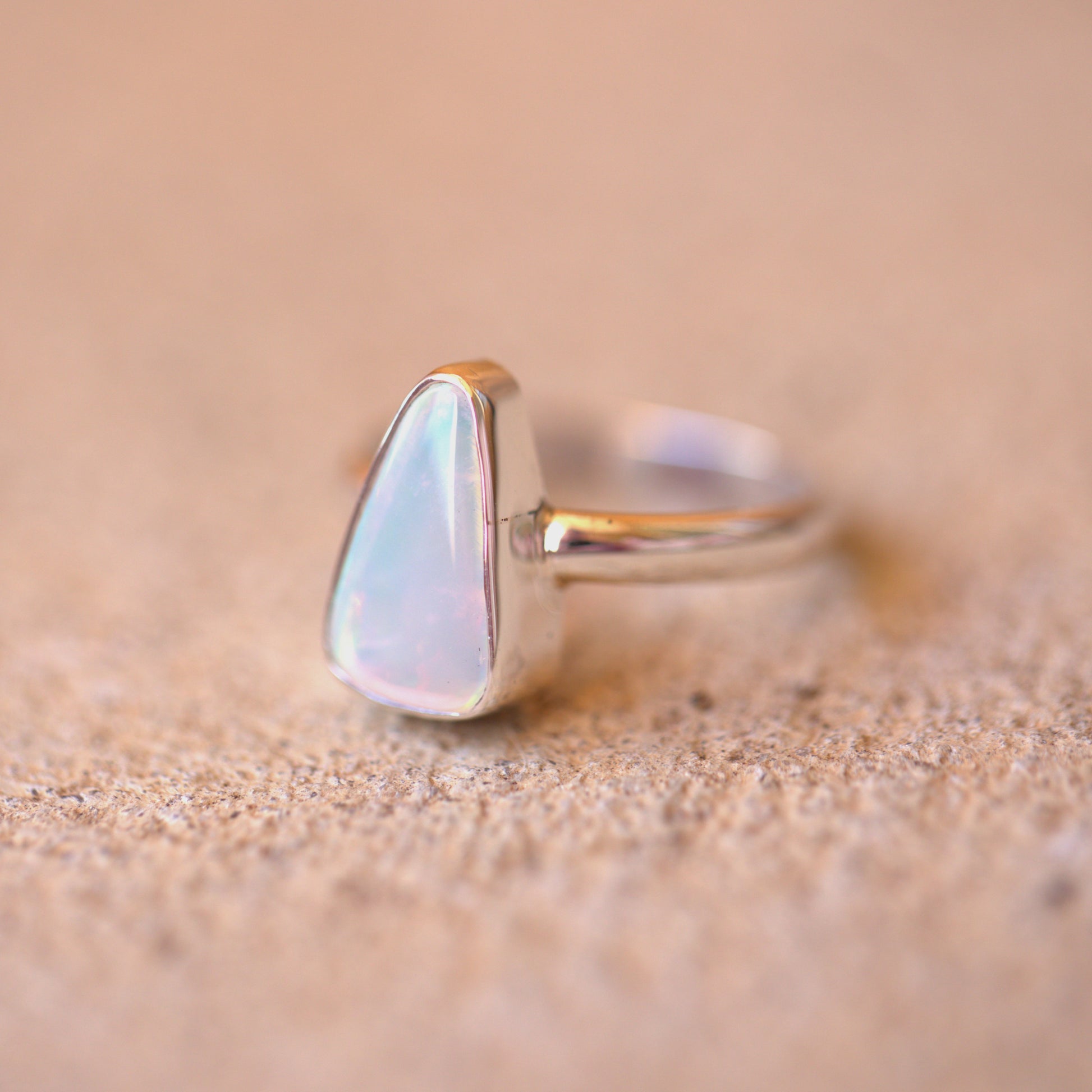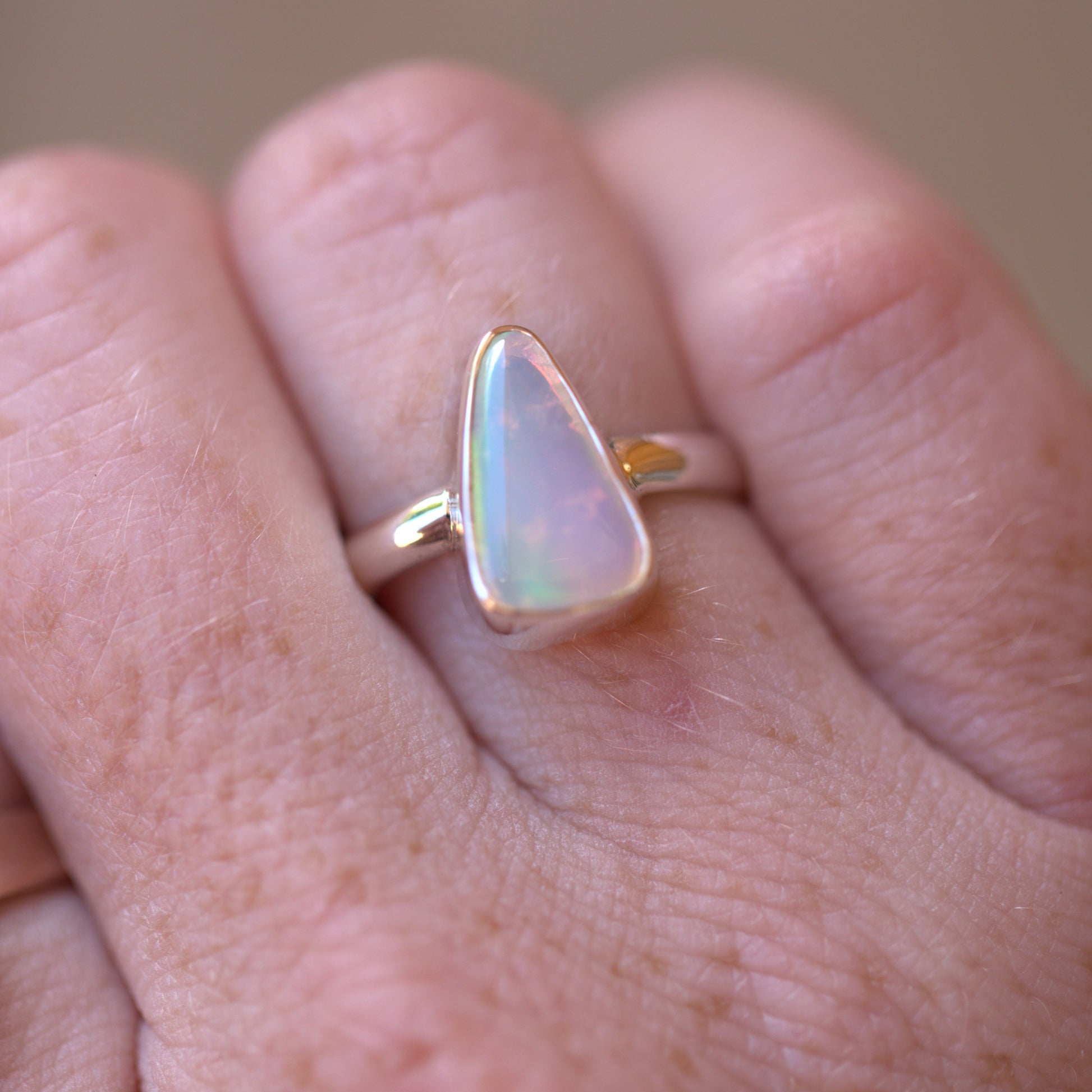 Yet another amazing solid Australian Opal that has to be seen in person to really understand its beauty. The amazing flash in this is like nothing else!! Looking at it straight on, it has NO colour. As soon as you move it though, it's electric. Like the back of a CD. I also have a pair of shoes that match this ring. It's soooo cool!!