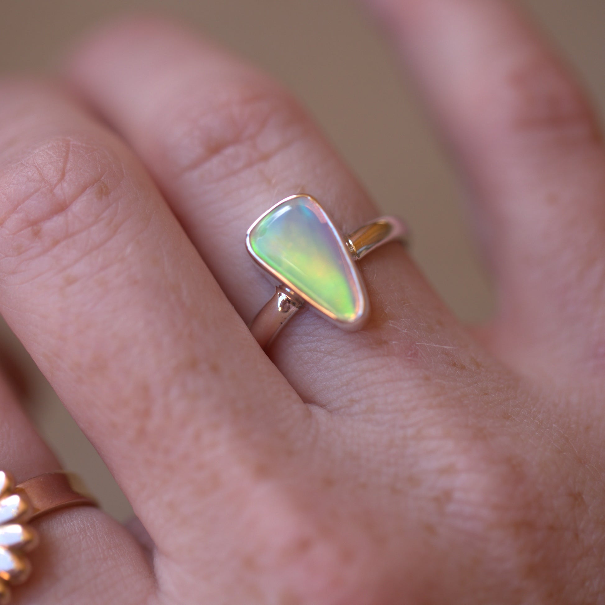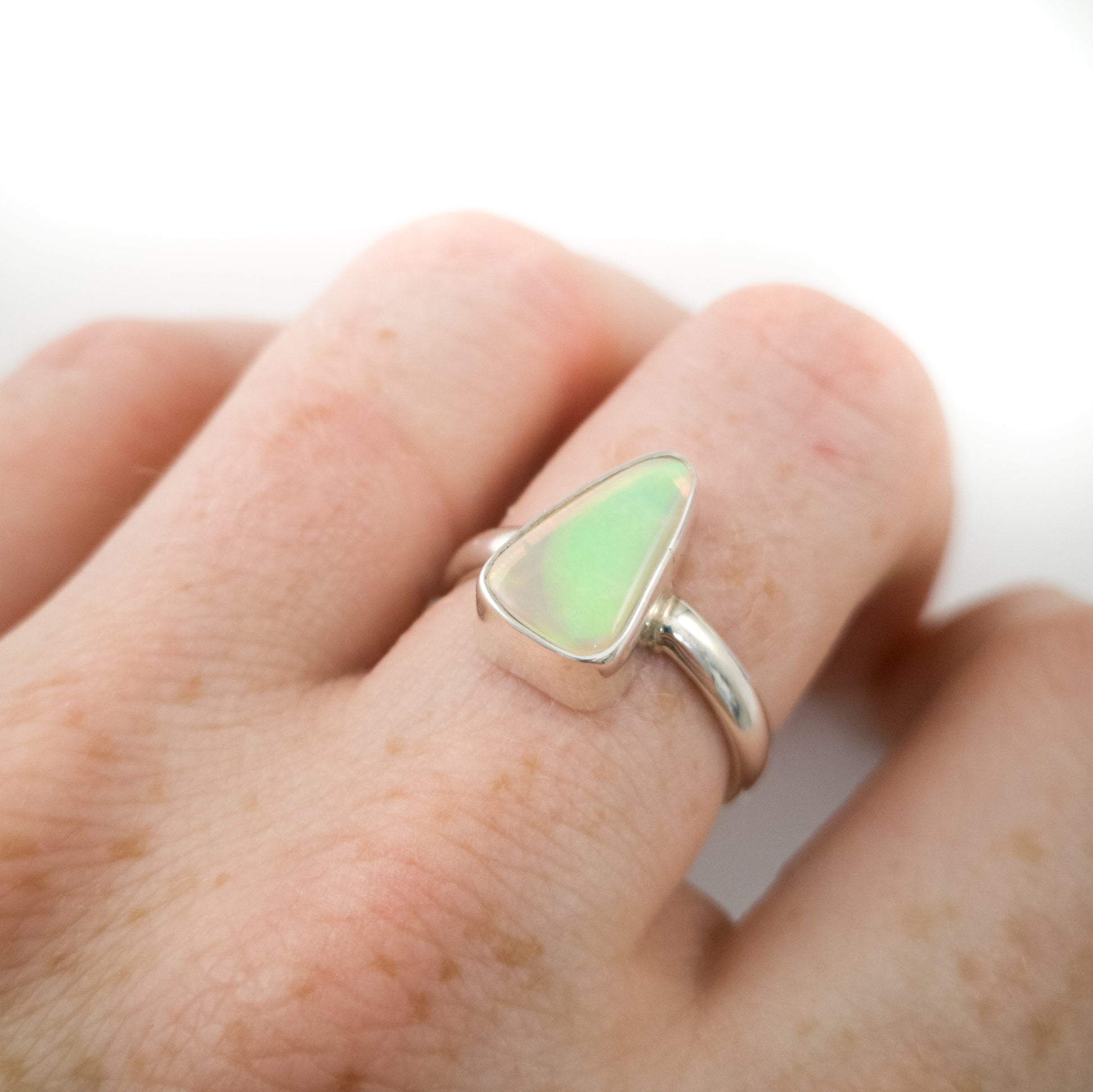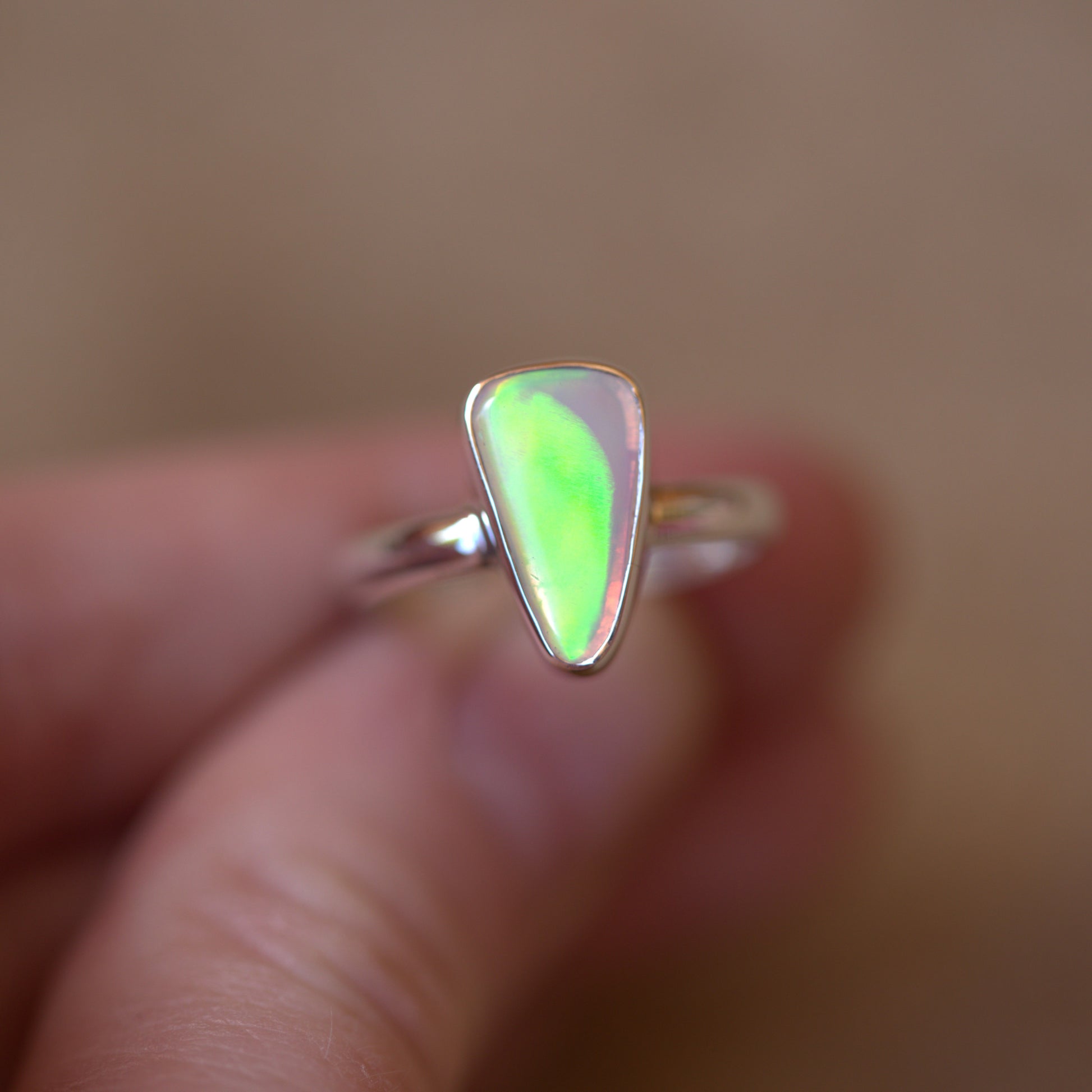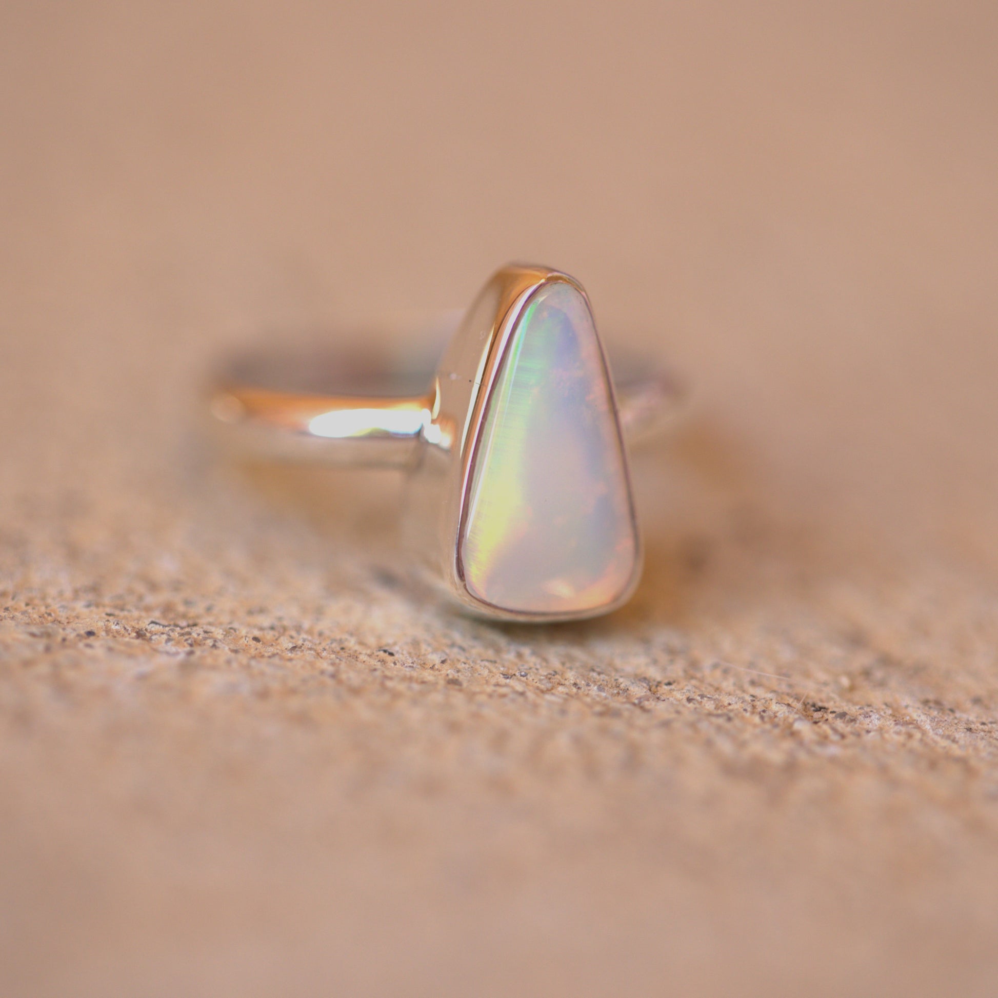 Yet another amazing solid Australian Opal that has to be seen in person to really understand its beauty. The amazing flash in this is like nothing else!! Looking at it straight on, it has NO colour. As soon as you move it though, it's electric. Like the back of a CD. I also have a pair of shoes that match this ring. It's soooo cool!!